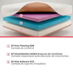 Pillow top interno Max Flowing D28: conforto inicial e resposta rapida aos movimentos Espuma viscoelastica NASA: alivia pontos de pressao e se molda ao corpo Base D33: sustentacao firme e alinhamento da coluna