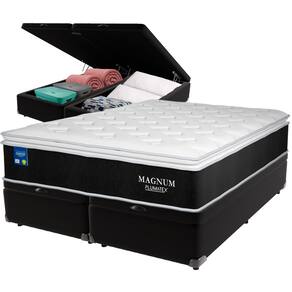 Bem-vindo(a) ao nosso catálogo! Apresentamos a você uma descrição completa sobre esse produto:\nCom sua tecnologia avançada e design cuidadosamente elaborado, o colchão Magnum é uma escolha confiável e durável para quem busca um descanso de qualidade. Com a combinação de Malha Chronos 180 g/m², Molas Ensacadas, Espuma D26 e EPS Pillow Top High Tech, o Magnum oferece uma experiência de sono incomparável.\nColchão: Modelo: Magnum; Marca: Plumatex; Tamanho: Queen; Dimensões: 158x198x18cm; (largura x comprimento x altura) Conforto: Molas Ensacadas, Espuma D26, Pillow Top High Tech; Proteções: Antiácaro, antialérgico, antifungo, antimofo; Possui: Malha Chronos 180 g/m²; Peso máximo recomendado: até 110Kg (por pessoa); Garantia: 03 meses;\nA Malha Chronos 180 g/m² proporciona um toque macio e agradável, enquanto as molas ensacadas garantem uma distribuição uniforme do peso corporal, além de reduzir a transferência de movimento. A Espuma D26 oferece suporte firme e conforto durante toda a noite, e o EPS Pillow Top High Tech proporciona um acabamento luxuoso para um sono ainda mais agradável.\nBase Box com Baú: Marca: KazaMix; Cor do Baú: Preto; Revestimento da Cama: Material Sintético; Material dos pés: Madeira; Estrutura: Madeira; Abertura: Pistão a gás; Peso máximo recomendado: até 150kg de cada lado; Altura do Baú: 32cm; Altura dos pés: 5cm; Altura total: 37cm; Garantia: 03 meses; Selo Ecologicamente Correto.\nInvista no seu sono e experimente o conforto e a qualidade!\nAtenção: Antes de finalizar sua compra, certifique-se de que as dimensões do produto sejam adequadas para serem transportadas pelos elevadores, portas, escadas e corredores de sua residência. Ressaltamos que não nos responsabilizamos pelo transporte do produto por meios específicos, como escadas, guinchos ou içamentos.