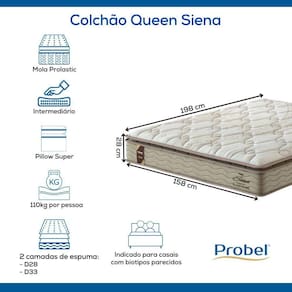 As espumas do Colchão Queen Siena foram desenvolvidas com a Tecnologia ProMax Probel, que passam por rigorosos testes de qualidade em laboratório e recebem tratamento antiácaro e antifungo.