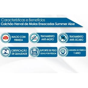 Imagens Meramente Ilustrativas. Não nos responsabilizamos pela montagem/instalação dos produtos. Todas as informações divulgadas são de responsabilidade exclusiva do fabricante/fornecedor. Forração Revestimento do Colchão: Jacquard/Malha Nível de Firmeza do Colchão: Macio c/ Firmeza Nossa Avaliação do Colchão: Qualidade Muito Boa Peso Máximo Suportado do Colchão: 110 kg Tempo de Garantia do Colchão: 12 meses Vantagens Extras de Colchão: Ecologicamente Correto Certificação de Qualidade do Colchão: ISO 9001 Tecido de Revestimento da Faixa Lateral do Colchão: Bordado Bordado do Revestimento do Colchão: Contínuo Tecido com Tratamento do Colchão: AntiÁcaro e AntiFungo Tipo de Pillow: Pillow Top Europeu Modo de Utilização do Colchão: One Side Camadas Interna do Estofamento de Espuma do Colchão: Alta Qualidade Tipo de Mola do Colchão: Bonnel É eco-friendly: Sim É antiácaros: Sim Tipo de Espuma do Colchão: Espuma sem CFC Com moldura perimetral: Não Com pegas laterais: Não Número de registro/certificação INMETRO: N/A Tipo de Produto: N/A É kit?: Não Condição do item: Fonte do produto: N/A Código universal de produto (GTIN): 7899285971739 Produto precisa de Montagem?: Sim, a montagem é simples mas sugerimos a contratação do nosso serviço de montagem (para os CEPs em que o serviço está disponível) ou de algum experiente de sua preferência Descrição do Tamanho: 20.00x:158.00x198.00 cm Estado de Origem: RJ País de origem: Nacional Peso Produto Com Embalagem (Kg): 46.93 Material para Filtro: N/I Cor Mobly: N/I Condição do Item: Numeral: 0 Não se Aplica: N/A Não Possui: Não Linha/Modelo: Herval Cor Cnova: Blush Cor Meli: Ciano Categoria - Sub: Colchão de Molas Bonnel Categoria - Pai: Colchão Comnto Embalagem: 198.00 Largura Embalagem: 158.00 Altura Embalagem: 20.00 Kit: 0 Peso: 46.93 Kg Peso Real Kg: 46.93 Peso Cubado: 156.42 Volumes: 1 M3: 0.63 Comnto/Profundidade: 198 cm Largura: 158 cm Altura: 20 cm Tamanho Montado: Larg:158.00 x Comp/Prof:198.00 x Alt: 20.00 Comnto/Profundidade Montado: 198.00 Largura Montado: 158.00 Altura Montado: 20.00 MPN: 5000974 Tamanho Cama Colchão: Queen Marca: Herval Fabricante: Herval Linha: Herval