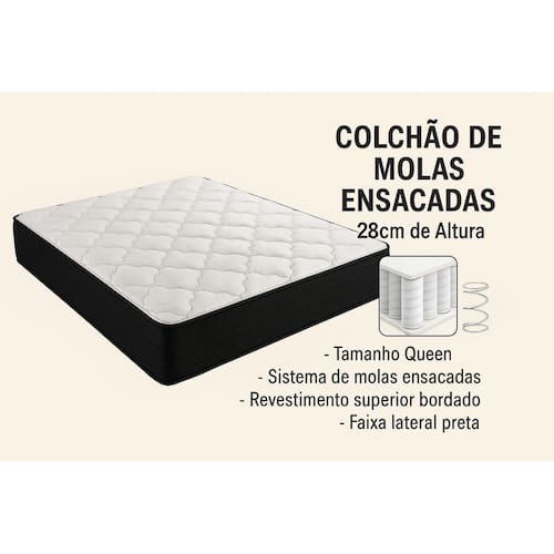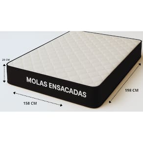 - Proteções: Antiácaro - Antialérgico - Antifungo - Antimofo;- Acabamento: Bordado em Matelassê;- Matéria prima: Poliéster/Bordado;- Mola: Ensacada;- Peso máximo recomendado: até 100kg (por pessoa);- Garantia: 3 meses;- Dimensões do produto (altura x largura x comprimento): 28x158x198cm;