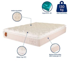 Projetado para oferecer um sono de qualidade, prezando pela sua saúde e bem-estar, o Colchão Queen Size Safira Prorelax garante proporcionar noites tranquilas com muito conforto. Pensando nisso, ele é produzido com Molas Ensacadas - com 208 molas por m² confeccionadas com alto teor de carbono oferecendo maior resistência, resiliência ao molejo e proporcionando maior durabilidade ao colchão, espuma D-45 e Pillow Top com Viscoelástico qual possui a função se moldar ao formato do corpo para reduzir os pontos de pressão em áreas como ombros, quadris e joelhos, possibilitando que o corpo tenha uma sustentação uniforme. Além disso, possui tratamento antimofo, antifungos, antiácaros e antialérgico e conta com materiais de alta qualidade para que você sinta mais segurança e aconchego para aproveitar seu sono ao máximo.