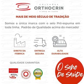 Sempre primando pela qualidade e durabilidade de seus produtos, a Orthocrin é a única do segmento a possuir o selo Pró-Espuma em toda a sua linha. Além disso, seus colchões têm os selos da Abicol, Qualidade 360° e a certificação Inmetro..