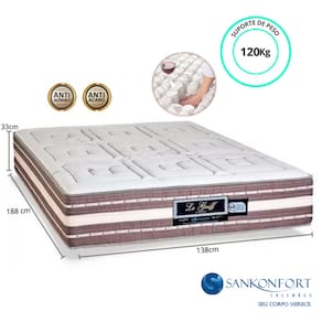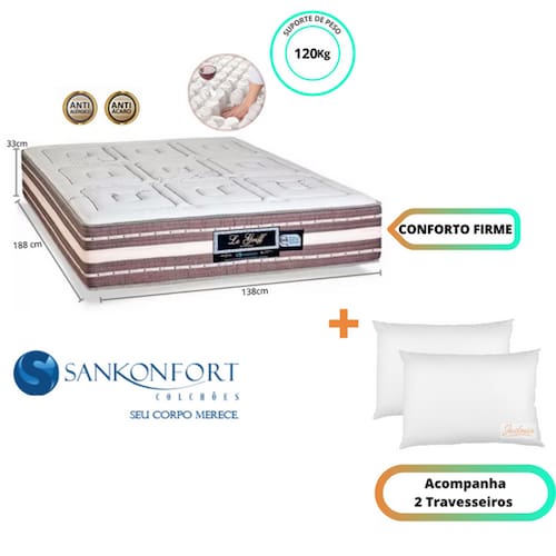 Colchão Sankonfort Le Griff Casal 138x188x33 + 2 Travesseiros FibraColchão Casal Sankonfort Le Griff 138x188x33 Linha Alta - Acompanha 2 Travesseiros Fibra Características: Tamanho: Casal Tampo com fibras naturais de bambu. Tela aerada que substitui o respiro.Tratamento: antiácaro, antibactéria e antifungos Peso suportado: até 120 kg por pessoa Dimensões: Altura: 33 cm Largura: 138 cm Profundidade: 188 cmIMPORTANTE: Antes de comprar conscientize-se que é de responsabilidade do cliente verificar todas as dimensões do produto e certificar-se que o mesmo entre em elevadores, portas e corredores, pois produtos que possuem grandes dimensões são extremamente pesados. Em caso de entregas em prédios, o mesmo somente será entregue através do elevador do edifício. As transportadoras contratadas, não realizam em nenhuma hipótese entregas por escadas ou içamentos, pois além do risco de lesões e acidentes ao entregador, o produto bem como as instalações do edifício pode ser danificado devido ao seu peso e tamanho. Caso no momento da entrega, não seja possível colocar o material no elevador, a entrega será considerada como concluída no térreo do edifício. Todos os nossos produtos tem as dimensões descritas na página de compra e descrição do produto.
