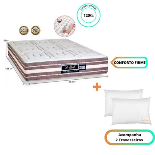 Colchão Sankonfort Le Griff Casal Queen 158x198x33 + 2 Travesseiros FibraColchão Casal Sankonfort Le Griff 158x198x33 Linha Alta - Acompanha 2 Travesseiros Fibra Características: Tamanho: QueenTampo com fibras naturais de bambu. Tela aerada que substitui o respiro.Tratamento: antiácaro, antibactéria e antifungos Peso suportado: até 120 kg por pessoa Dimensões: Altura: 33 cm Largura: 158 cm Profundidade: 198 cmIMPORTANTE: Antes de comprar conscientize-se que é de responsabilidade do cliente verificar todas as dimensões do produto e certificar-se que o mesmo entre em elevadores, portas e corredores, pois produtos que possuem grandes dimensões são extremamente pesados. Em caso de entregas em prédios, o mesmo somente será entregue através do elevador do edifício. As transportadoras contratadas, não realizam em nenhuma hipótese entregas por escadas ou içamentos, pois além do risco de lesões e acidentes ao entregador, o produto bem como as instalações do edifício pode ser danificado devido ao seu peso e tamanho. Caso no momento da entrega, não seja possível colocar o material no elevador, a entrega será considerada como concluída no térreo do edifício. Todos os nossos produtos tem as dimensões descritas na página de compra e descrição do produto.