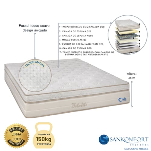 A tecnologia Superlastic Spring garante molas contínuas entrelaçadas e helicoidais, proporcionando maior resistência, durabilidade e um molejo perfeito que distribui o peso de forma uniforme por toda a superfície. O acabamento sofisticado complementa a alta qualidade do produto, tornando o Colchão Totalité a escolha ideal para quem busca noites de sono mais tranquilas, confortáveis e com um toque de elegância.