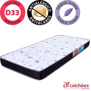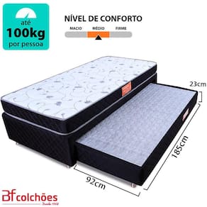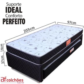 Colchão de solteirão bordado com espuma de densidade 33, com conforto excepcional para um sono de qualidade. O box, tem a função básica de box para o seu colchão e a segunda peça, recolhida na parte inferior, poderá ser retirada e usada diretamente como um colchão, sustentado em uma base de madeira, com pés e rodízios, garantindo bom descanso devido a espuma de alta qualidade e muito confortável.