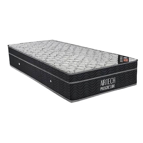 Colchão Solteiro Airtech Progressive Ortobom 29x188x88 O repouso de qualidade que você precisa e merece acaba de ganhar o aliado perfeito: o Colchão Airtech! Com tecnologia de molas nanolastic, sistema no turn e tratamento antialérgico e antiácaro, essa peça vai fazer toda a diferença na hora do tão merecido descanso, pois oferece uma experiência de relaxamento de verdade para todo o corpo ao mesmo tempo em que cuida da sua saúde e manda aquele mau humor matinal pra bem longe. Perfeito para uma noite completa de verdade ou para uma soneca depois do almoço, prepare-se para um novo conceito de sono saudável.\nMEDIDAS\nAltura 29 cm\nLargura 88 cm\nComprimento 188 cm\nCARACTERÍSTICAS\nModelo Airtech Progressive\nTipo do produto Colchão Solteiro\nAmbiente Quarto\nFabricante Ortobom\nCor Preto\nMaterial Estrutura em Molas Nanolastic; Placa EPS; Ortopillow; Bordado em Matelassê; Manta de Espuma D26 Pró; Faixa Lateral em Camurça; No Turn (não precisa virar); Tratamento Antialérgico e Antiácaro; Tecido em Malha e Camurça; Acabamento em Debrum\nTipo de Colchão Espuma\nTipo de Mola Nanolastic\nNecessita Montagem Não\nINFORMAÇÕES IMPORTANTES\nObjetos decorativos que porventura apareçam na foto, não acompanham o produto. Não nos responsabilizamos pela montagem/instalação dos produtos.\nMontagens, desmontagens e instalações são responsabilidades do cliente. Indicamos que contrate uma empresa de montagem ou um montador de sua confiança.\nAlém disso, favor verificar se os pés e acessórios estão dentro do forro inferior do produto. Em suma, todas as informações divulgadas sobre o produto são de responsabilidade do Fabricante.\nAs cores do produto podem variar de acordo com o seu monitor, a iluminação do ambiente em que você está e até mesmo a sua percepção visual. Além da cor, pequenos detalhes e acabamentos podem não ficar evidentes na foto, por isso as imagens são meramente ilustrativas.