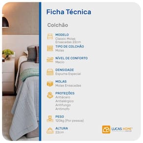Desenvolvido para proporcionar o descanso merecido, O colchão Classic Molas Ensacadas é produzido com matéria prima de alta qualidade atendendo às exigências dos padrões técnicos. Possui molas ensacadas e uma camada de espuma que garante uma sustentação extra, suportando até 120Kg, e garantindo um conforto intermediário que te auxiliara no alívio da canseira do dia a dia.