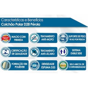 Camadas Interna do Estofamento de Espuma do Colchão - Alta Qualidade Densidade da Espuma do Colchão - D28 Nível de Firmeza do Colchão - Macio c/ Firmeza Peso Máximo Suportado do Colchão - 90 kg