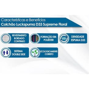 COLCHÃO (BENEFÍCIOS) Tecido com Tratamento - AntiÁcaro e AntiFungo Tipo de Bordado do Tecido de Revestimento - Contínuo Tipo Tecido de Forração Revestimento - Bordado de Alta Qualidade Tipo de Tecido de Revestimento da Faixa Lateral - Bordado Cor do Tecido de Revestimento da Faixa Lateral - Clara Estampada Cor do Tecido do Tampo - Claro Estampado Modo de Utilização - Double Side