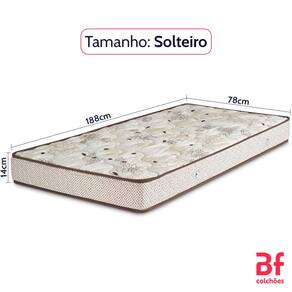 Medidas: Solteiro (14 cm x 78 cm x 188 cm - Altura x Largura x Profundidade)Suporte de Peso: Até 150 kg por pessoaNível de Conforto: FirmeDensidade: Espuma D45 CertificadaRevestimento: Poliéster bordado em matelassê com tratamento antimicrobianoGarantia: 01 anoMarca: BF Colchões
