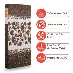 Colchão Solteiro Firme Espuma D45 Coretto Certificado Inmetro O Colchão Solteiro D45 Certificado Inmetro é um produto de alta qualidade e conforto. Ele possui uma densidade D45, o que significa que é ideal para pessoas de peso médio/alto. Além disso, ele é certificado pelo Inmetro, o que garante a sua e qualidade. O colchão é fabricado com materiais de , proporcionando um suporte adequado para a coluna e uma superfície macia para um sono tranquilo e ões:- Altura: 12cm;- Largura: 88cm;- Comprimento: 188cm;- Espuma D45 100% Poliuretano 45kg/m;- Peso máximo recomendado: 150kg;- Sem adição de EPS, 100% espuma.Tratamentos:- Anti-ácaro: os ácaros do pó da casa são a principal causa de alergias do aparelho respiratório. Por isso nossos tecidos e colchões possuem um tratamento especial contra a proliferação de ácaros e outras bactérias, prevenindo e evitando crises alérgicas.- Anti-alérgico: possui um tratamento especial contra fungos e bactérias, prevenindo e evitando crises alérgicas.- Anti-mofo: fungos e bactérias se reproduzem em uma velocidade muito rápida, que pode aumentar devido alguns fatores como a temperatura.Conforto:- Conforto Firme: o nível de conforto do colchão deve ser escolhido de acordo com os hábitos, necessidades e costumes de cada pessoa, pois, é ele que determina a sensação de bem estar.