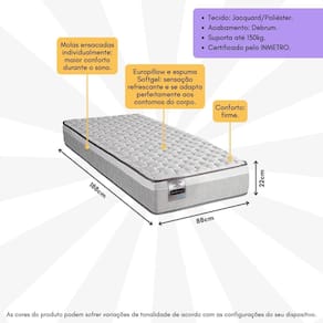 Tecido: Jacquard/Poliéster Acabamento: Debrum Com Pillow: Sim Tipo de Pillow: Europillow Duplo Pillow: Não Conforto: Firme Peso Suportado: 130kg Hipoalergênico: Não Antiácaros: Não Eco-friendly: Sim Sistema: Turn-free (não é necessário virar o colchão, apenas girá-lo a cada 15 dias). Selo INMETRO: 09977-001-01/2023 Fabricante: Inducol