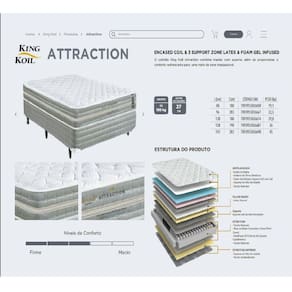 O colchão King Koil Attraction combina maciez com suporte, com um nível de conforto intermediário ao lado de um conjunto de molas ensacadas, além de proporcionar o conforto refrescante para uma noite de sono inesquecível. Ambiente Principal: Quarto Antiácaro: Sim Antialérgico: Sim Antifungo: Sim Certificado: INMETRO Comprimento: 188 cm Cor: Cinza/Branco Cor do Produto: Cinza/Branco Itens Inclusos: 1 Colchão Nível de Conforto: Intermediário Origem do Produto: Nacional Peso: 19.1 Possui Certificado: Sim Possui Pillow: Não Precisa virar: Sim Recomendações de Uso, Manutenção e Limpeza: Fazer o giro quinzenal e manter em local arejado. Revestimento: Malha Tamanho: Solteiro Tipo do Colchão: Mola