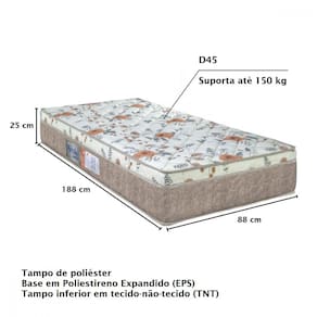 Características: - Uma cama de espuma D45 - Possui uma camada de Poliestireno Expandido -EPS- - Tampo em poliéster - Revestimento 100 Poliéster - Nível de conforto: Muito firme - Tampo inferior em TNT - Produto é Antialérgico e Antiácaro - Suporta até 150kg - Garantia de 12 meses
