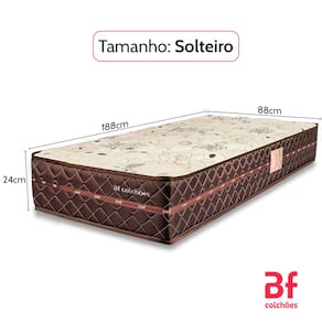 Características: Tamanho: Solteiro (88cm x 188cm X 24cm - Largura x Profundidade x Altura); Suporte de Peso: Até 130 Kg por pessoa; Nível de conforto: Firme; Espuma D33 Certificada; High Support Board: Centro em poliestireno expandido (EPS); Revestimento: Poliéster com bordado matelassado; Hipoalergênico: Tratamento nas fibras que elimina os agentes alérgenos; Garantia: 01 ano; Marca: BF Colchões.