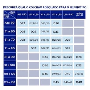 Conforto sem igual Com o Supreme suas noites de sono nunca mais serão as mesmas! Com a espuma D33, seu novo colchão esbanja conforto e tem a firmeza ideal que acomoda seu corpo de maneira com que ele fique descansado para o dia seguinte. Com rigorosos testes de qualidade, a durabilidade deste colchão é garantida oferecendo milhares de noites de descanso. Seu revestimento em tecido plano, que por sua vez não é propenso ao acúmulo de poeira, tornando sua limpeza mais fácil.