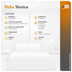 Colchão Solteiro Twin Size Molas Ensacadas San Diego Marrom Colchao Solteiro Twin Size Molas Ensacadas Pillow Top San Diego 96x203x30cm DETALHES DO COLCHAO: * TIPO DE PILLOW Pillow Top - e uma camada extra que fica por cima do colchao para deixa-lo mais macio.