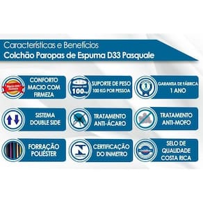 BENEFÍCIOS GERAIS DO COLCHÃO Certificados de Qualidade - Qualidade Aprovada - Qualidade Costa Rica - INMETRO Vantagens Extras do colchão D33 - Ecologicamente Correto Nossa Avaliação - Qualidade Muito Boa Tempo de Garantia - 12 meses