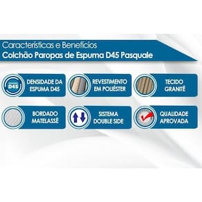Imagens Meramente Ilustrativas. Não nos responsabilizamos pela montagem/instalação dos produtos. Todas as informações divulgadas são de responsabilidade exclusiva do fabricante/fornecedor. Tipo Tecido de Forração Revestimento: Poliéster | Tipo de Estrutura do Bloco de Espuma: D45 | Tipo de Conforto: Macio c/ Firmeza | Nossa Avaliação: Qualidade Muito Boa | Peso Máximo Suportado: 150 kg | Tempo de Garantia: 12 meses | Vantagens Extras do colchão D45: Ecologicamente Correto | Certificados de Qualidade: Qualidade Aprovada | Tipo de Bordado do Tecido de Revestimento: Matelassê | Tecido com Tratamento: AntiÁcaro e AntiFungo | Modo de Utilização: Double Side | Camadas Interna do Estofamento de Espuma: Alta Qualidade | É infantil: Não | É eco-friendly: Sim | É antiácaros: Sim | É ortopédico: Sim | É kit: Não | Material: Tecido | Fonte do produto: N/A | Com moldura perimetral: Não | Com pegas laterais: Não | Número de registro/certificação INMETRO: N/A | Condição do item: Novo | Classificação da Cama: Casal | Produto: N/A | Cômodo Indicado: Multiuso | Código universal de produto (GTIN): 7890372985714 | Condição do Item: Novo | Link Site: https://www.costaricacolchoes.com.br/produtos.asp?produto=17555 | Numeral: 0 | Não se Aplica: N/A | Não Possui: Não | Linha/Modelo: Colchões de Espuma Paropas | Cor Cnova: Blush | Cor Meli: Ciano | Contatos Sac Fábrica: sac@paropas.com.br | Categoria Trilha: Colchão> Colchão de Espuma D45 | Categoria - Sub: Colchão de Espuma D45 | Categoria - Pai: Colchão | Comprimento Embalagem: 188.00 | Largura Embalagem: 128.00 | Altura Embalagem: 20.00 | Kit: 0 | Peso: 30.08 Kg | Peso Real Kg: 30.08 | Peso Cubado: 120.00 | Volumes: 1 | M3: 0.48 | Comprimento/Profundidade: 188 cm | Largura: 128 cm | Altura: 20 cm | Tamanho Montado: Larg:128.00 x Comp/Prof:188.00 x Alt: 20.00 | Comprimento/Profundidade Montado: 188.00 | Largura Montado: 128.00 | Altura Montado: 20.00 | Tamanho Cama Colchão: Casal | Data Cadastro: 2023-9-9 15:0:22 | Sigla Estoque: 2 | Marca: Paropas Marca: COLCHÃO PAROPAS Ean: 7890372985714