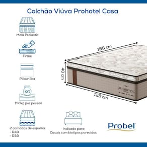 As espumas do Colchão Viúva Prohotel Casa foram desenvolvidas com a Tecnologia ProMax Probel, que passam por rigorosos testes de qualidade em laboratório e recebem tratamento antiácaro e antifungo.