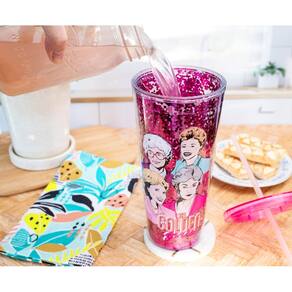 - GOLDEN GIRLS: Cold Cup apresenta os personagens icônicos Blanche Devereaux, Sophia Petrillo, Dorothy Zbornak e Rose Nylund. Escrito abaixo deles está "The Golden Girls". O fundo do copo é preenchido com glitter rosa. O copo frio é completo com uma tampa rosa e canudo.