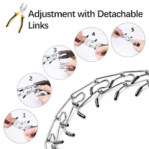 O perímetro da coleira de treinamento para cães pode ser ajustado, adequado para cães pequenos, médios e grandes cães. Você pode adicionar ou remover correntes individuais na coleira de aperto para se ajustar ao pescoço do seu cão conforme necessário. Ajuste com ferramentas como alicates. - ?Treinamento correto?--- Coleira de aperto para cães, fornece pressão necessária de treinamento enquanto protege as áreas sensíveis das vias aéreas e do pescoço dos cães. Não há necessidade de gritar com um cão ou castigar. Você só precisa puxar a coleira de treinamento e o cão vai parar de ser atrevido imediatamente. - ?Segura e eficaz? --- A coleira de treinamento para cães coloca pressão uniforme nos lados do pescoço e não na traqueia, as extremidades das garras da coleira de asfixia são protegidas por pontas de borracha que podem evitar danos ao pescoço do seu cão. - ?TAMANHO AJUSTÁVEL?--- O perímetro da coleira de treinamento para cães pode ser ajustado, adequado para cães pequenos, médios e grandes cães. Você pode adicionar ou remover correntes individuais na coleira de aperto para se ajustar ao pescoço do seu cão conforme necessário. Ajuste com ferramentas como alicates. - ?Material de alta resistência?--- Nossa coleira de pinos é feita de aço inoxidável cromado de alta resistência recomendado por treinadores. As coleiras de garras para cães têm um revestimento prateado para elos que podem proporcionar um período de uso estável para seus cães. - Um cão chamado Abby perdeu o olho direito por causa de um acidente. O cão tornou-se sensível e frágil. O dono de Abby descobriu que Abby ficaria muito feliz toda vez que ele o pegava para jogar, então vendeu sua casa e comprou um iate, e começou uma viagem com Abby em 25 estados. Embora Abby tivesse apenas um olho para a segunda metade de sua vida, o amor que o dono deu a Abby deu a Abby o mundo.
