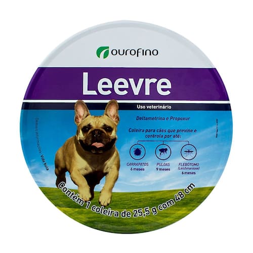 COLEIRA ECTOPARASITICIDA LEEVRE PARA CÃES Uso Veterinário. Deltametrina e Propoxur. Coleira para cães que previne e controla por até: Carrapatos: 6 meses. Pulgas: 9 meses. Flebótomo: 6 meses. Modo de Marca: Não Informado