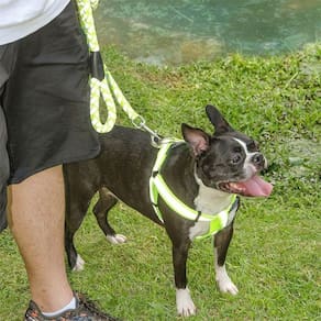 Essenciais para os passeios do dia a dia, as Guias trançadas com peitoral refletoras da Plasvale Pets são ideais para os passeios noturnos. As faixas refletoras brilham no escuro, facilitando a identificação do animal. As guias com peitoral proporcionam maior conforto que a coleira tradicional, são produzidas em material resistente, possui mosquete com engate duplo que garantem segurança, evitando acidentes e o desgaste rápido da gola.