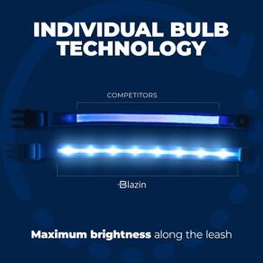 - Lâmpadas LED independentes ultra brilhantes – As coleiras para cães iluminadas Blazin apresentam lâmpadas LED separadas que fornecem quase 360 graus de iluminação, garantindo a segurança do seu cão à noite. Essas lâmpadas individuais proporcionam brilho consistente em todo o colarinho, ao contrário das alternativas de tira única que diminuem conforme a luz se expande.