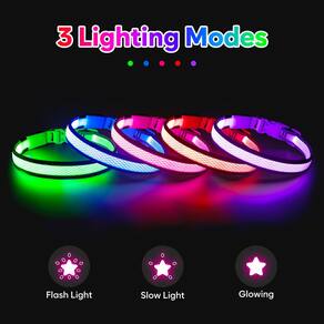- ?Leve, respirável para seus cães?Esta coleira iluminada para cães é feita de material de nylon resistente que faz com que seu cão se sinta mais confortável, também vem com um anel em D de metal para fixação da coleira do cão.