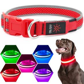 - ?Leve, respirável para seus cães?Esta coleira iluminada para cães é feita de material de nylon resistente que faz com que seu cão se sinta mais confortável, também vem com um anel em D de metal para fixação da coleira do cão.