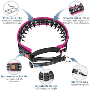 Fácil ajuste e uso conveniente: nossa coleira para cães que puxam tem um controle deslizante ajustável para caber facilmente no pescoço do seu cão. A fivela de segurança garante que a coleira seja fácil de colocar e tirar, e também possui um anel em D resistente para fixação da coleira para facilitar a caminhada. Costura refletiva de