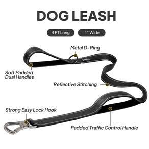 PetiFine Coleira resistente para cães de 1,2 m com alça dupla acolchoada macia, trelas para cães com fecho forte e durável, guia de caminhada de nylon refletivo para cães de raças grandes, médios e pequenos, preta