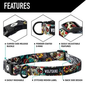 Coleira Wolfgang resistente, ajustável para cães com fivela de nylon de liberação rápida para caminhadas e treinamento, estampa LosMuertos, média