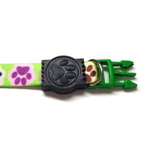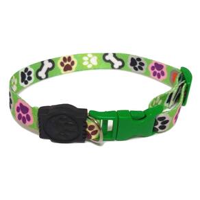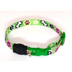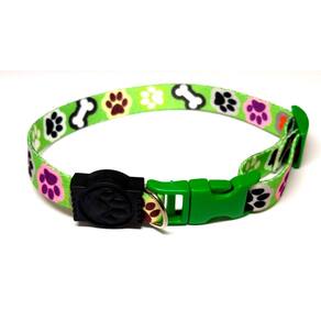 Coleiras confeccionadas em fita 15 mm de seda estampa do patinhas e ossinhos na cor verde; Presilha de plástico altamente resistentes com passadores de ajuste e borracha em formato de pata; cor: verde Tamanho único. Especificações Circunferência: 22 a 35 cm. O seu pet vai ficar todo estiloso e alegre com a coleira de seda. Marca: Não Informado Ean: 7438637797483