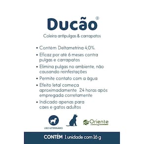 Coleira Veterinária Ducão Contra Pulgas e Carrapatos Pet A Coleira Antipulgas e Carrapatos Ducão foi desenvolvida para oferecer proteção eficaz contra pulgas e carrapatos em cães e gatos adultos. Sua fórmula contém Deltametrina 4,0%, garantindo ação prolongada e segura por até 6 meses contínuos. O produto atua eliminando parasitas diretamente no animal e também no ambiente, evitando novas infestações. É resistente à água, permitindo que o pet mantenha a proteção mesmo durante banhos ou em dias chuvosos.