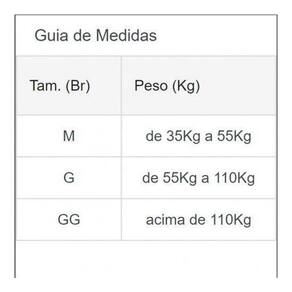 G = De 55 kg a 110 Kg Tórax: 120 cm