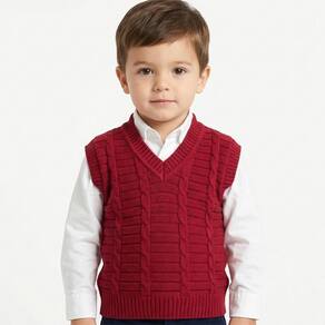 Colete de Trançado Tricô Kids Canelado feito em tecido algodão e acrílico, gola em V, estampa trançada e etiquetas personalizadas.