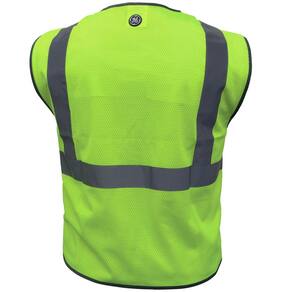 Colete de segurança GE de alta visibilidade com acabamento refletivo, tecido de malha respirável, 1 bolso externo no peito, 1 bolso interno na cintura, fecho com zíper.