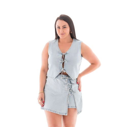 O colete jeans em laço é o tradicional reinventado. Confeccionado em jeans 100% algodão, é uma peça versátil, perfeita para compor looks modernos em todas as estações, especialmente quando combinado com o shorts-saia que forma conjunto.