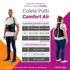 O colete putti comfort air hidrolight é uma nova e mais aprimorada versão do produto, agora com um corretor postural integrado e na cor preta, muito mais elegante. Características possui 6 talas de alumínio são 6 talas de alumínio moldável que limitam os movimentos de extensão, flexão e de rotação e flexão lateral do tronco, proporcionando a estabilização da coluna toracolombossacra posicionadas estrategicamente para maior conforto na região vertebral. Corretor postural integrado possui uma chapa de plástico semi rígido polipropileno nas costas que vai do início da região sacral até o fim da cervical e mais duas chapas sobrepostas no abdômen que também servem para sustentação e auxílio na hora de vestir o produto. Produzido em tecido transpirável a parte posterior do colete é confeccionada de tecido respirável e sem elasticidade favorecendo a estabilização. Já a parte da frente é de neoprene, que possui propriedades elásticas facilitando a expansão do abdômen durante a respiração. Tração extra de tiras aderentes elástico as faixas elásticas proporcionam tração extra que intensificam a compressão do produto. Bolso para ajuste frontal para a justar o produto, o colete putti possui dois bolsos na frente que facilitam o processo para o usuário conseguir vesti-lo sozinho. Estabiliza as regiões torácica, lombar e sacral as duas alças de ajuste no ombro quando tracionadas, trabalham juntamente com a chapa de polipropileno na região torácica, oferecendo ao usuário um corretor postural integrado ao seu colete para uma recuperação completa. Ajustes dinâmicos e anatômicos cada tamanho p, m e g possui duas variáveis de fechamento da circunferência abdominal, estreito e largo. Indicação auxílio no tratamento de patologias da coluna toracolombossacra; hérnias; traumatismos; contraturas; artroses; lesão medular; instabilidades de tronco; alterações neurológicas;