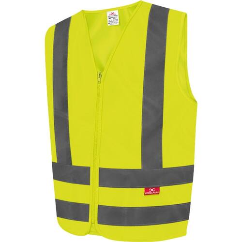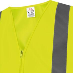 Colete de alta visibilidade em tecido 100 % poliéster, com fechamento em zíper, sem bolso e faixas retrorrefletivas para garantir segurança em ambientes de tráfego intenso ou baixa luminosidade.