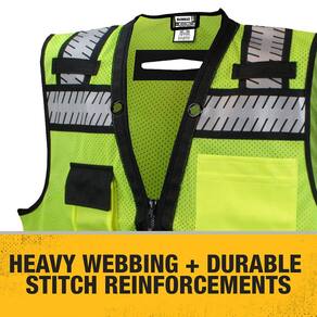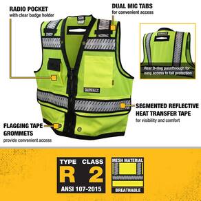 DEWALT DSV521 Colete Surveyor Heavy Duty Classe 2, GG - Fecho de zíper e abas duplas de microfone nos ombros - Fita refletiva segmentada de transferência de calor paralelo de 5 cm. - Malha 100% poliéster de alta visibilidade com bolsos de sarja sólida. - Várias listras refletivas horizontais e duas verticais. - Bolso no peito do rádio com suporte de identificação transparente. - Bolso segmentado no peito, bolsos frontais inferiores grandes, bolso interno aberto para tablet