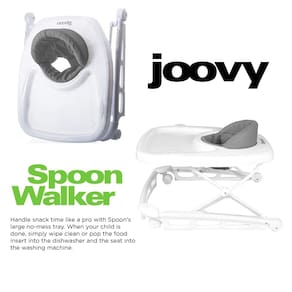 Andador Joovy Spoon - Aberto: 64,7 Largura x 70 P x 45,7 A cm.Peso do produto: cerca de 5,6 Kg - Para crianças de até 13,6 Kg. e 85 cm - Mobilidade do andador com a conveniência da cadeira alta com bandeja - Bandeja de grande porte com inserção removível, lavável na máquina - Assento almofadado de sustentação em opções de cores disponíveis