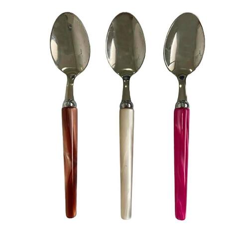 São fabricados em aço inoxidável 18/10 e apresenta um elegante cabo de madrepérola em acrílico colorido.