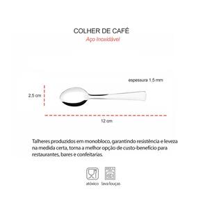 Contem: 12 Colheres de Cafe Dimensoes: 12 x 2,5 cm Espessura: 1,5 mm Material: Aço Inoxidavel