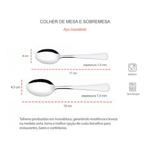 Colheres de mesa e sobremesa. Os talheres da linha Toronto sao produzidas em monobloco de aço inox. Garantindo resistencia e elegancia na medida certa, tornando a melhor aposta de custo-beneficio no segmento para restaurantes. Contem: 3 Colheres de Mesa Dimensões: 19 x 4,5 cm 3 Colheres para Sobremesa Dimensões: 17 x 4 cm Material: Aço Inoxidavel