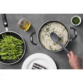 Para servir aquele arroz soltinho e delicioso em suas refeições, a colher de servir Tramontina Moldê em silicone cinza é indispensável. Produzida em nylon, ela resiste a temperaturas de até 180 °C e é a escolha perfeita para utilização em superfícies antiaderentes e cerâmicas. Ela é um item que proporciona resistência e que pode ir à máquina de lavar louças, otimizando sua rotina na cozinha. A colher de servir vem na cor cinza e ainda vai deixar sua cozinha e sua mesa cheias de estilo! Orientações Colher de silicone, que resiste até uma temperatura de 180 °C. Com furo passante no cabo possibilitando que seja pendurado na sua cozinha. Utensílio ideal para uso em panelas com revestimentos antiaderentes e cerâmicos, pois não danifica o produto. Pode ir à máquina de lavar louças facilitando seu dia a dia. Características Gerais EAN13 7891112298910 DUN14 17891112298917 NCM 3924.10.00 Peso Líquido 0,1100 kg. Peso Bruto 0,1150 kg. Metragem 0,000608 m³. Dimensões Embalagem (Compr. X Larg. X Alt.) 21x 75x 386 mm. Dimensões Produto (Compr. X Larg. X Alt.) 281x 66x 20 mm. Cor 1 63666A Hexa Observações Antes da primeira utilização, lave bem a peça e seque-a. Não utilizar esponja abrasiva para limpeza e para maior durabilidade do produto recomenda-se secar bem antes de guardar, mesmo após lavagem em máquina. O produto pode sofrer alterações no aspecto visual ao longo do uso, em virtude da pigmentação dos alimentos e degradação natural da cor do utensílio. Não deixar o utensílio em superfícies quentes por tempo prolongado. Não armazenar o utensílio junto a materiais cortantes e perfurantes. Para descarte do produto e embalagem siga as orientações de reciclagem vigentes.